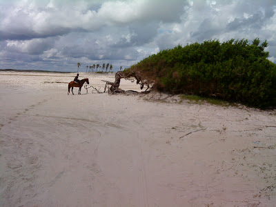 Gestern bin ich nach Jijoca gefahren, denn ich brauchte Bargeld und das ist hier nur zu ungünstigen Konditionen zu kriegen. Am Morgen nahm ich ein Gemeinschaftstaxi. Bereits nach rund einer viertel Stunde waren genügend Leute beisammen, man rief mir, es ging los. Der Chauffeur setzte mich in Jijoca dann gleich vor der Banco do Brasil ab, es klappte bestens und so hatte ich schon am Mittag alles erledigt. Und bin in Carla, die argentinische Schmuckverkäuferin hinein gelaufen. Sie meinte, ich solle doch den Paulo, den Italiener an der Lagune besuchen gehen. Dort sei es sehr schön. Mit einem weiteren Gemeinschaftstaxi bin ich also dorthin gefahren und wirklich, das Wasser in der Lagune ist sehr angenehm, die Farbe schöner als die des Meeres. Paulo hat seit 22 Jahren seine Pousada mit Restaurant an diesem Ort. Sie ist ein Tagesausflugsziel für Besucher von Jeri. Am Anfang, da hätte es in der Gegend vor allem Schweizer Hippies gehabt, so rund sechs hätten sich hier niedergelassen, er sei praktisch der einzige Italiener gewesen. Erst vor 5 Jahren, als der Ort langsam bekannter geworden sei, da sei eine wahre Einwanderungsflut aus Italien gekommen. Nicht gerade die besten Leute, das könne man nicht sagen. Drogen, Frauengeschichten, Filous, nicht unbedingt ein Umgang, den er pflege. Paulo ist mit einer Brasilianerin verheiratet, beide wohl aus gutem Haus, letztes Jahr 5 Monate in Indien und Nepal unterwegs, man reise gerne und wohnen könne er auch an verschieden Stellen in Italien oder Brasilien, man habe mehrere Häuser. Doch gefalle es ihm eben an der Lagune besonders gut. Das Leben hier, kein Stress. - Und irgendetwas müsse man ja machen im Leben, oder nicht?